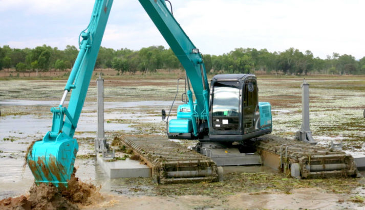 The undercarriage design offers extremely low ground pressure, making it the only undercarriage system that allows an excavator to work on swamps and soft terrain.
