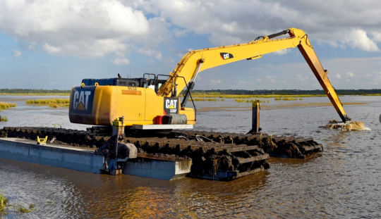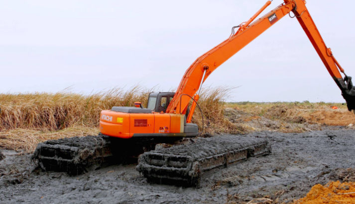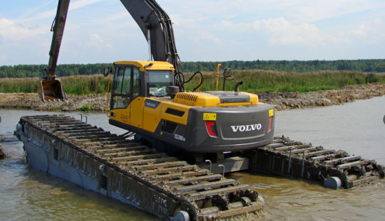 The undercarriage design offers extremely low ground pressure, making it the only undercarriage system that allows an excavator to work on swamps and soft terrain.