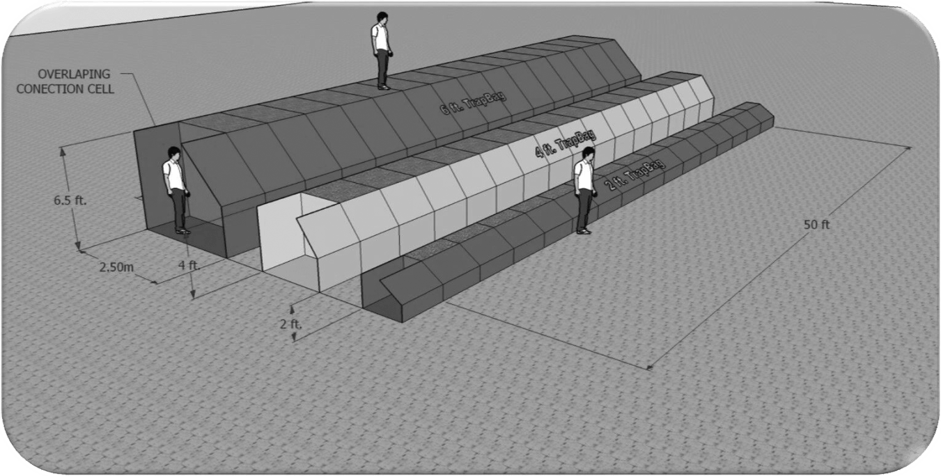 TrapBag® is a series of pentagon-shaped bags that are sloped on one side, vertical on the opposite side and open at the top for filling. Each of the cells are connected side by side like an accordion, each cell has a common wall with the next cell, and are collapsed during storage and deployment. The cells are made of high-strength textile. Each of the cells are self-contained yet rely on the next cell for added strength. If one of the cells is compromised, it will not affect the rest of the barrier, which will remain standing strong.